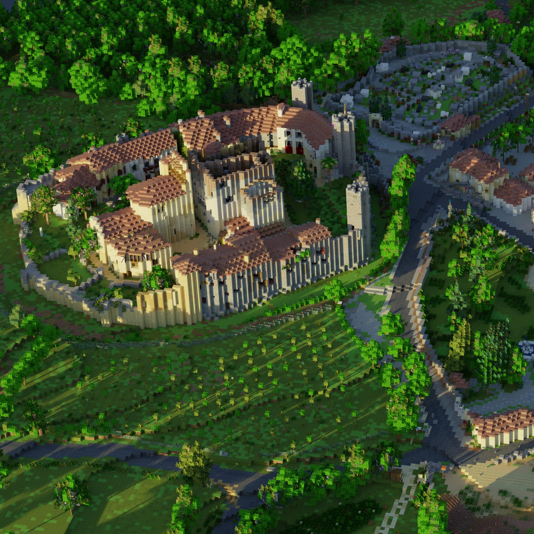 Reproduction d'un château médiéval, le Château du Miroir Blanc, avec des détails architecturaux et une attention particulière à l'environnement naturel.